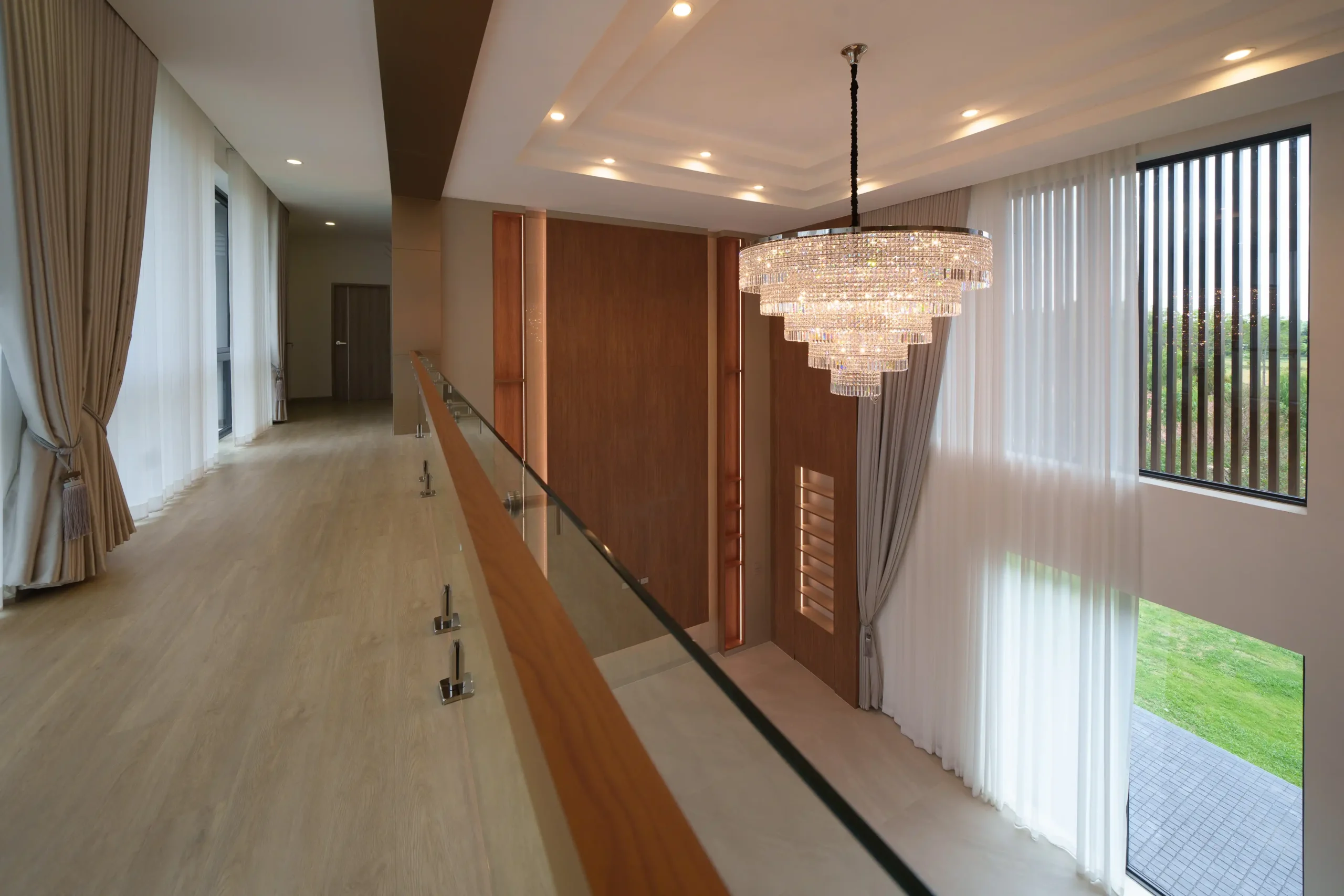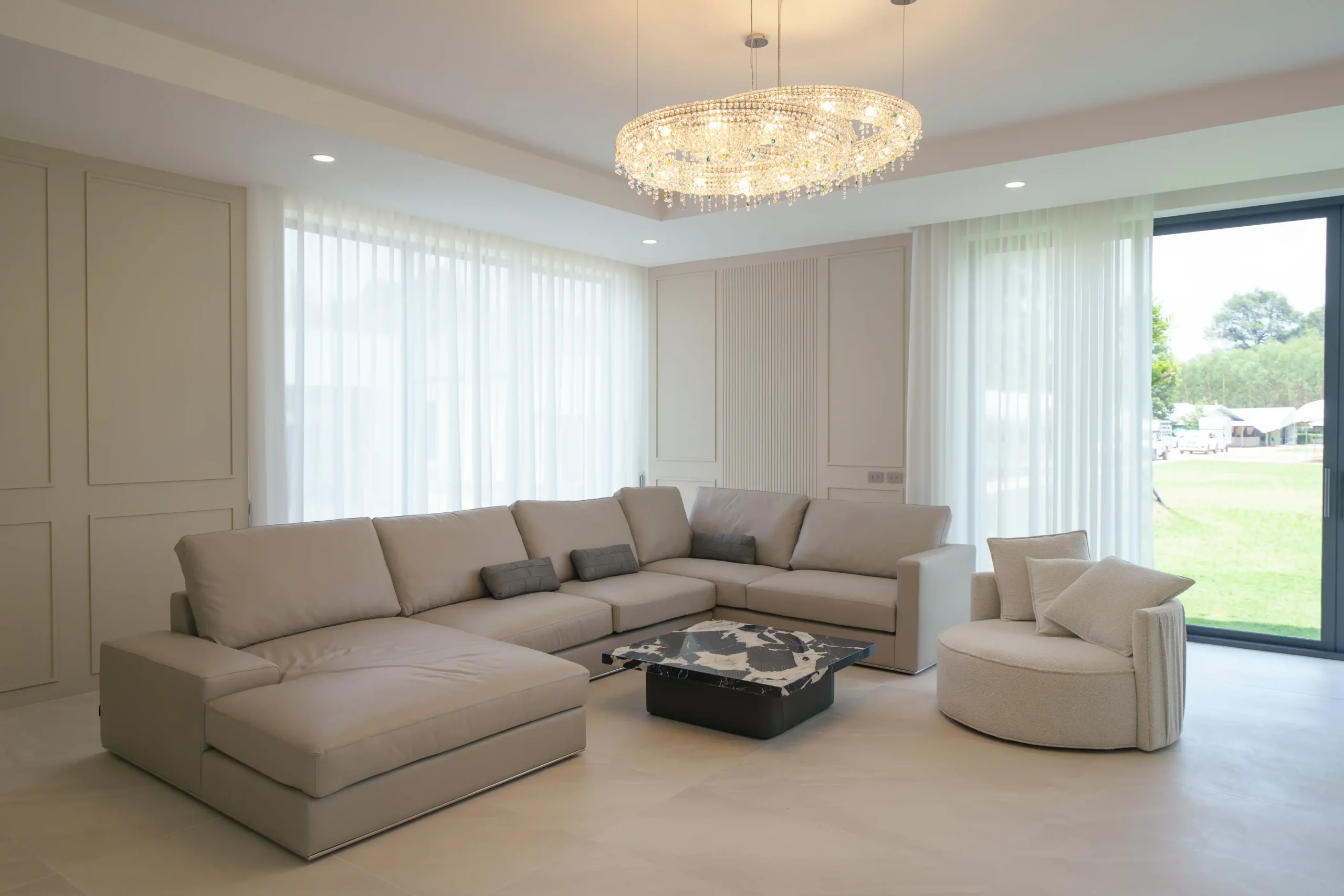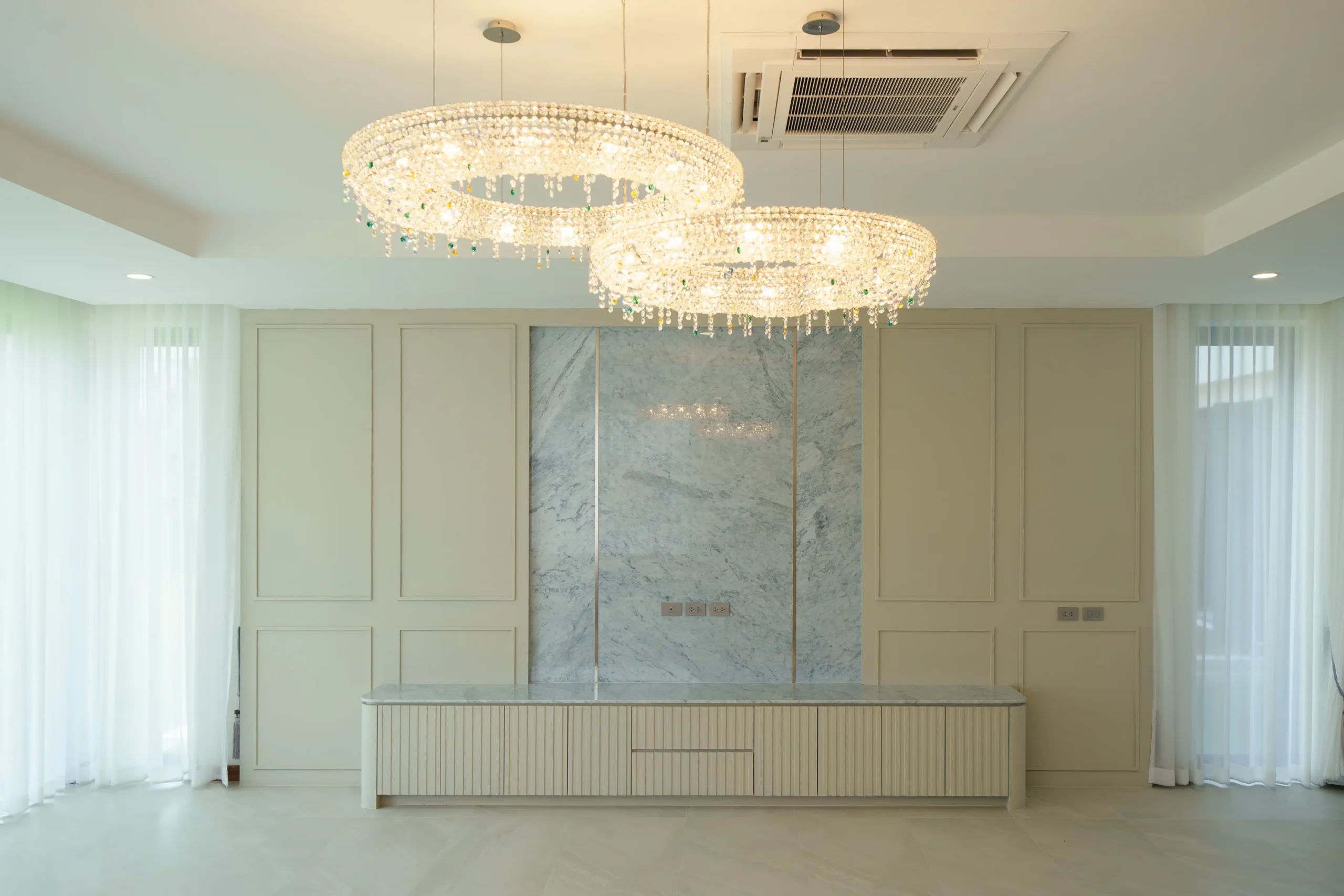 เพิ่มความหรูหราด้วยแชนเดอเลียร์คริสตัลฟอร์มวงกลมซ้อนชั้น ที่นอกจากจะเป็นจุดนำสายตาแล้วยังช่วยกระจายแสงไฟทั่วห้อง เสริมบรรยากาศให้บ้านอบอุ่นด้วยการจัดแสงฟซ่อนหลุมฝ้าและไฟดาวน์ไลท์อุณหภูมิสี Warm White ช่วยไล่ระดับแสงให้นุ่มนวล สบายตา ลดทอนความแข็งของวัสดุให้ดูอบอุ่นน่าพักผ่อน และเพิ่มความหรูหรา กับหน้าต่างบานใหญ่พร้อมผ้าม่านโปร่งแสง (Sheer Curtain) ช่วยกรองแสงแดดแรงๆ ให้กลายเป็นแสงนวลฟุ้งกระจายทั่วห้อง ให้ความรู้สึกเหมือนอยู่ในรีสอร์ตหรูตลอดทั้งวัน