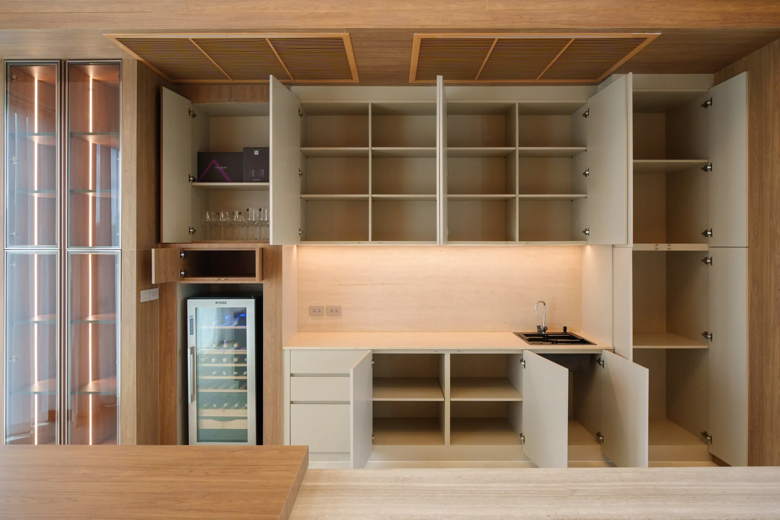 Hidden Pantry: เบื้องหลังบานตู้เรียบกริบในครัว คือสเตชั่นเก็บของขนาดใหญ่ที่เปิดออกมาพบกับชั้นวางของแห้ง ตู้แช่ไวน์ และซิงค์ล้างจานเล็กๆ ช่วยซ่อนความวุ่นวายจากสายตาแขกเหรื่อได้อย่างมิดชิด