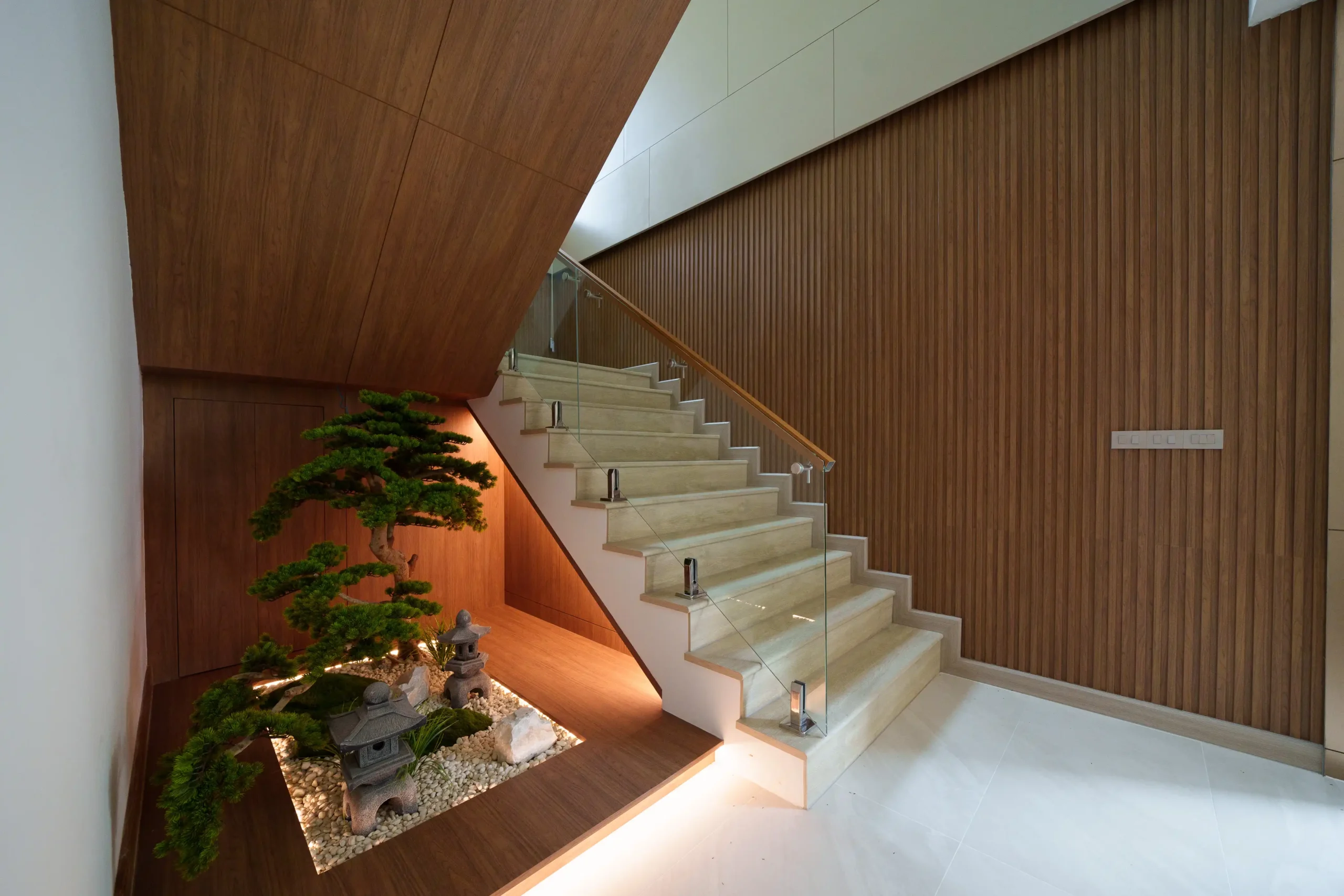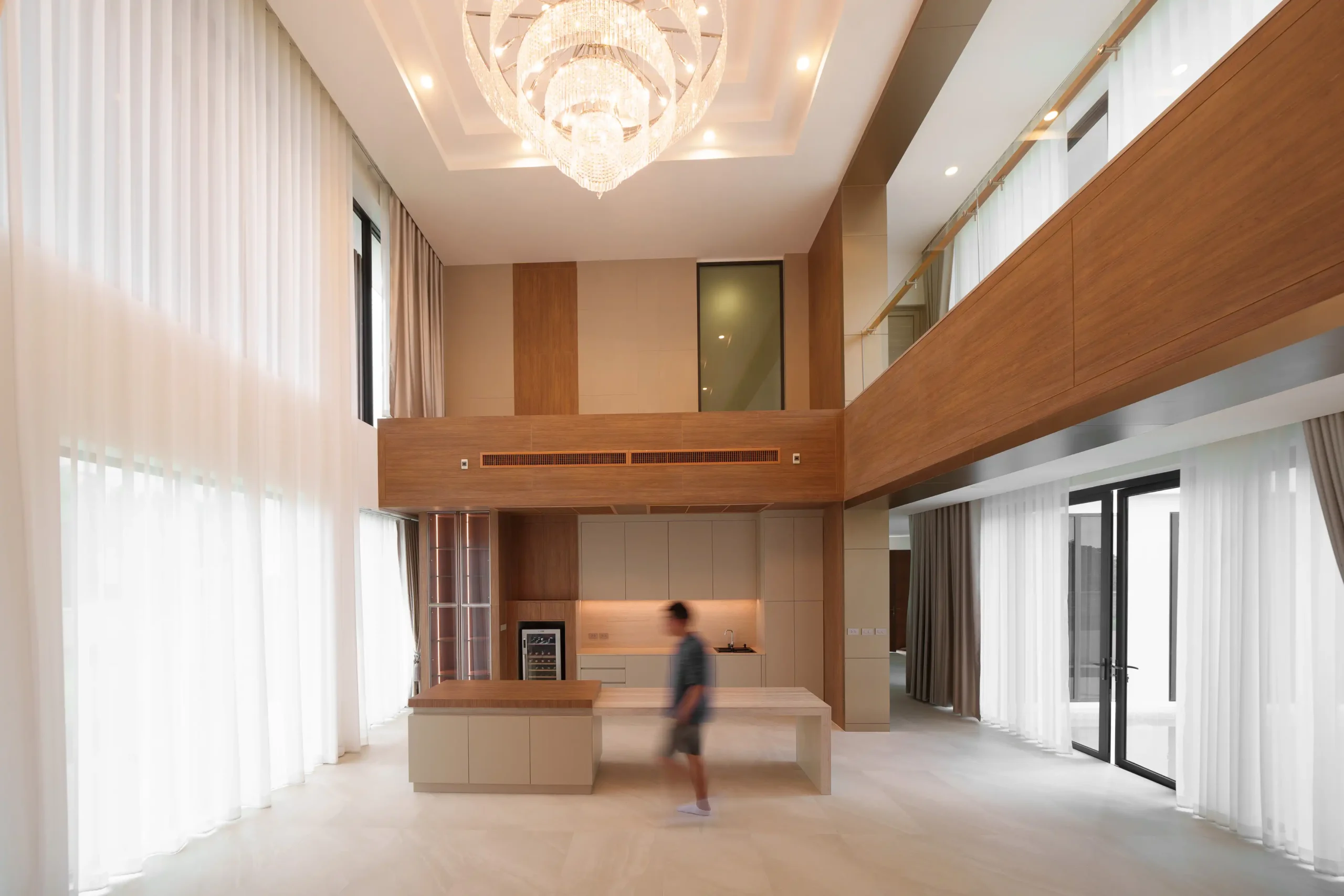 เราออกแบบดีไซน์ให้เน้นพื้นที่โถงเปิดรับแสงธรรมชาติผ่านกระจกสูง 8 เมตร ที่เป็นไฮไลท์สำคัญ เชื่อมโยงกับสเปซภายใน คุมโทนด้วยสีครีม เทาอ่อน และงานไม้ สร้างมิติให้บ้านดูโปร่ง สว่าง แต่ยังคงความสงบเป็นส่วนตัวในทุกช่วงเวลา