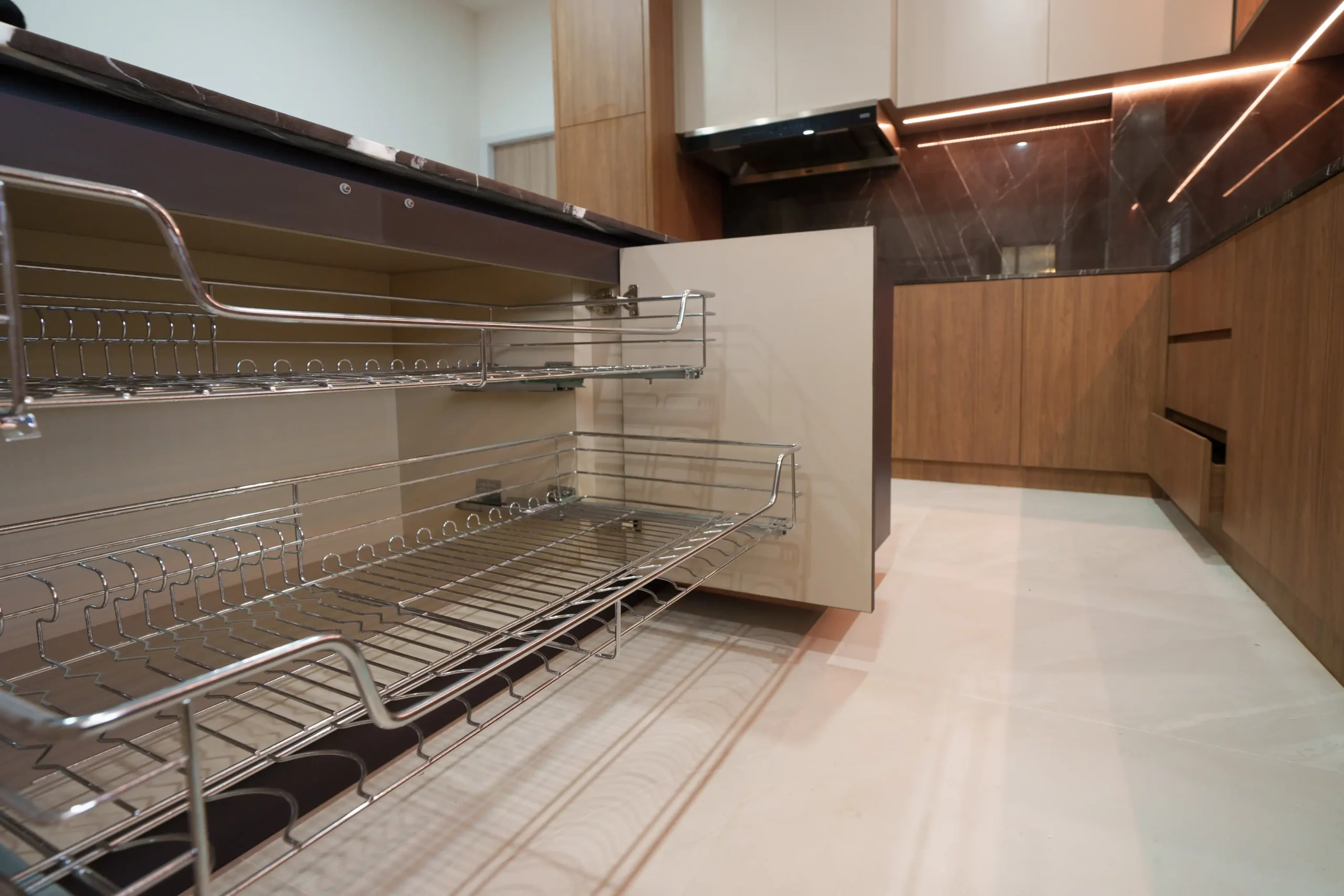Ergonomic Access: ชุดตะแกรงลิ้นชักบิ้วอิน (Pull-out mechanisms) ที่ดึงอุปกรณ์ครัวหรือของใช้ออกมาให้หยิบใช้ง่ายแค่ปลายนิ้ว