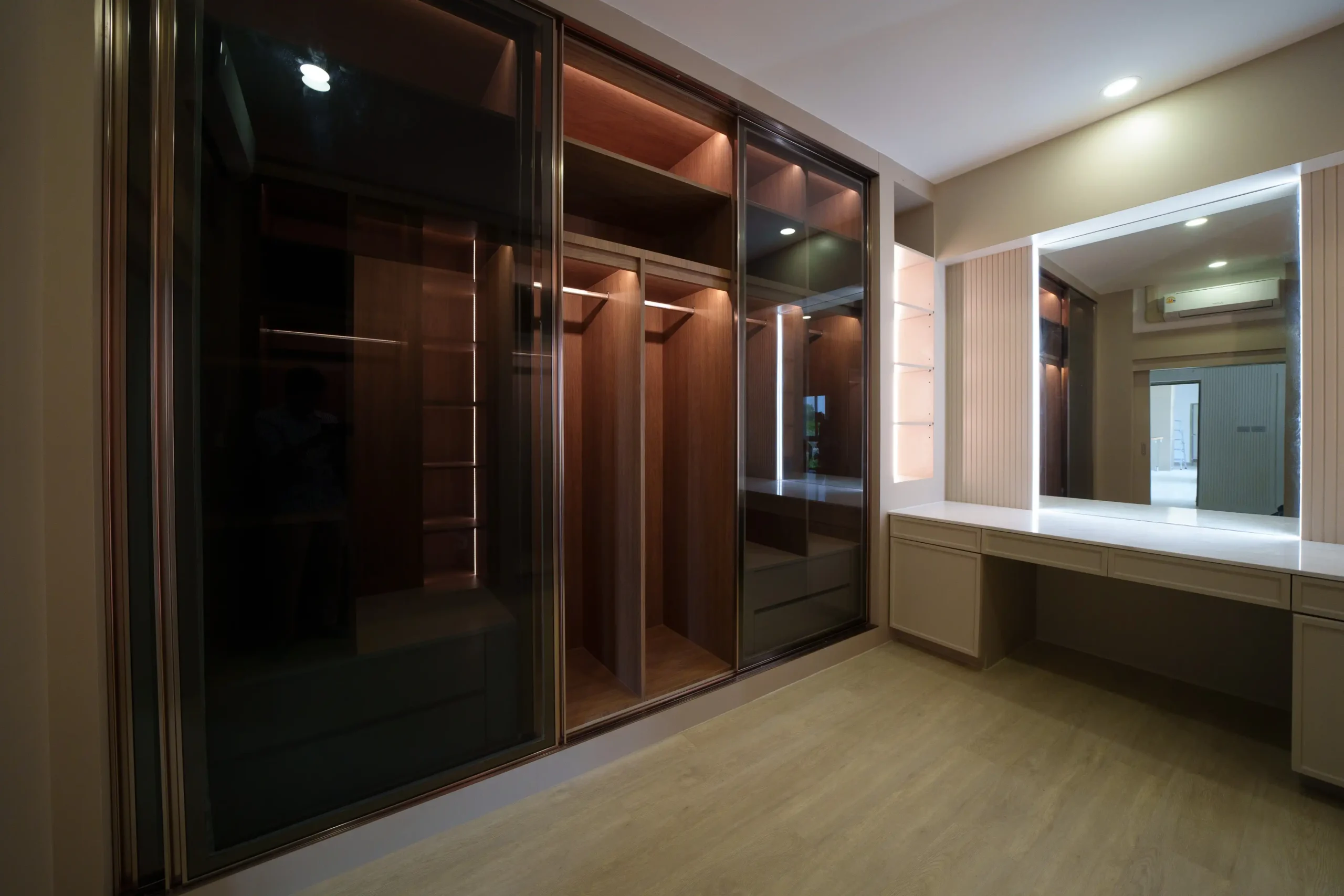 Glass Showcase with Integrated Lighting: ตู้เสื้อผ้าหน้าบานกระจกใส มาพร้อมไฟ LED Strip ที่ฝังซ่อนในชั้นวาง ช่วยขับเน้นกระเป๋าและชุดโปรดให้ดูโดดเด่นเหมือนอยู่ใน Boutique Shop ส่วนตัว