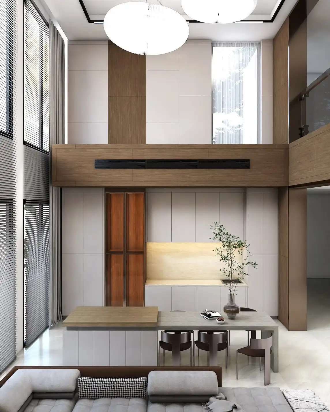 โถงบ้าน สูง 8 เมตรใช้โทนสีอบอุ่น ครีม เทาอ่อน น้ำตาลไม้ ตัดกับสีดำเงา ให้ผู้อยู่ได้มีความรู้สึกผ่อนคลาย